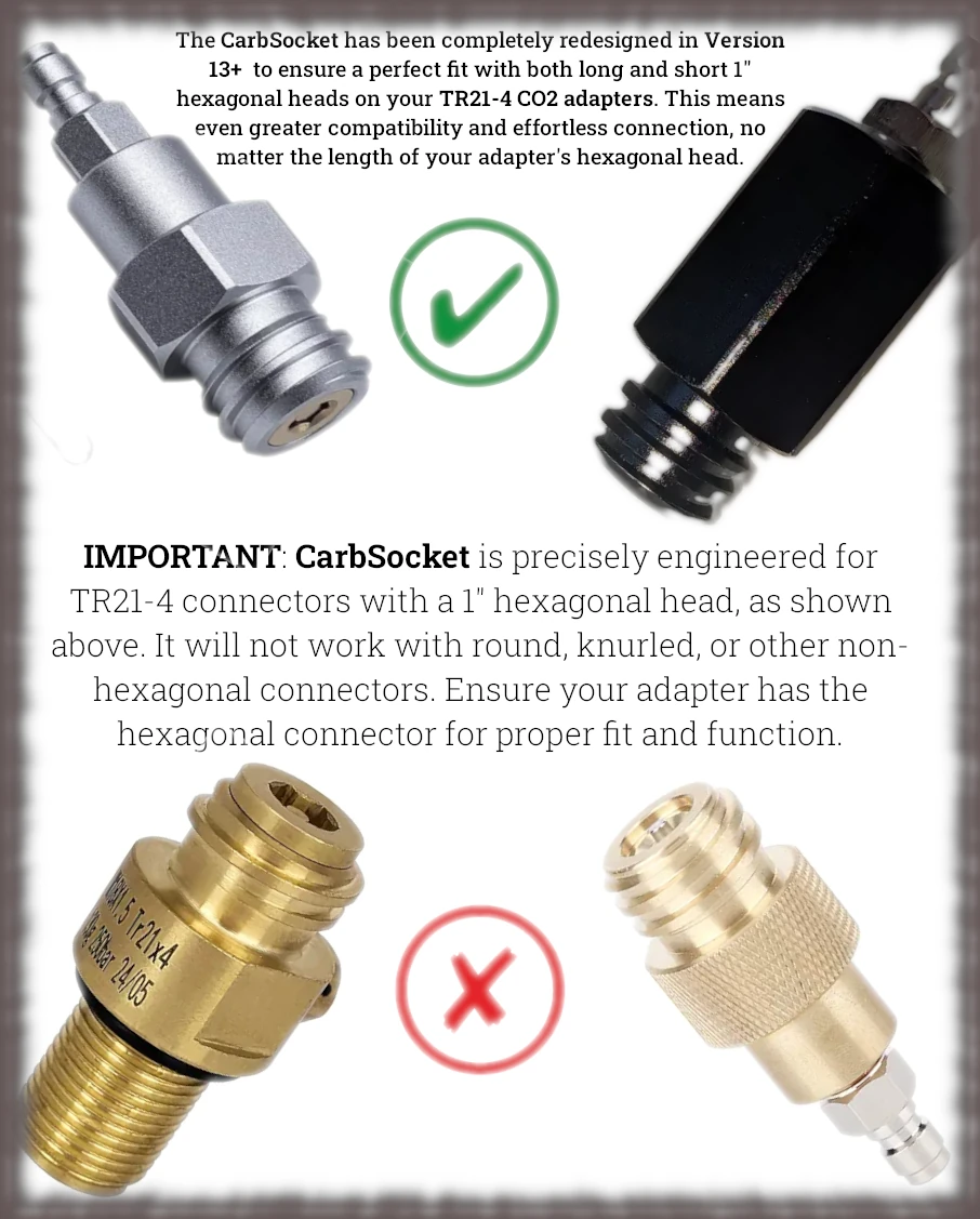 we're thrilled to introduce CarbSocket version 13, bringing even greater versatility and convenience to your sparkling water setup! this latest iteration has been meticulously redesigned to support a wider array of screw-in tr21-4 co2 connectors.